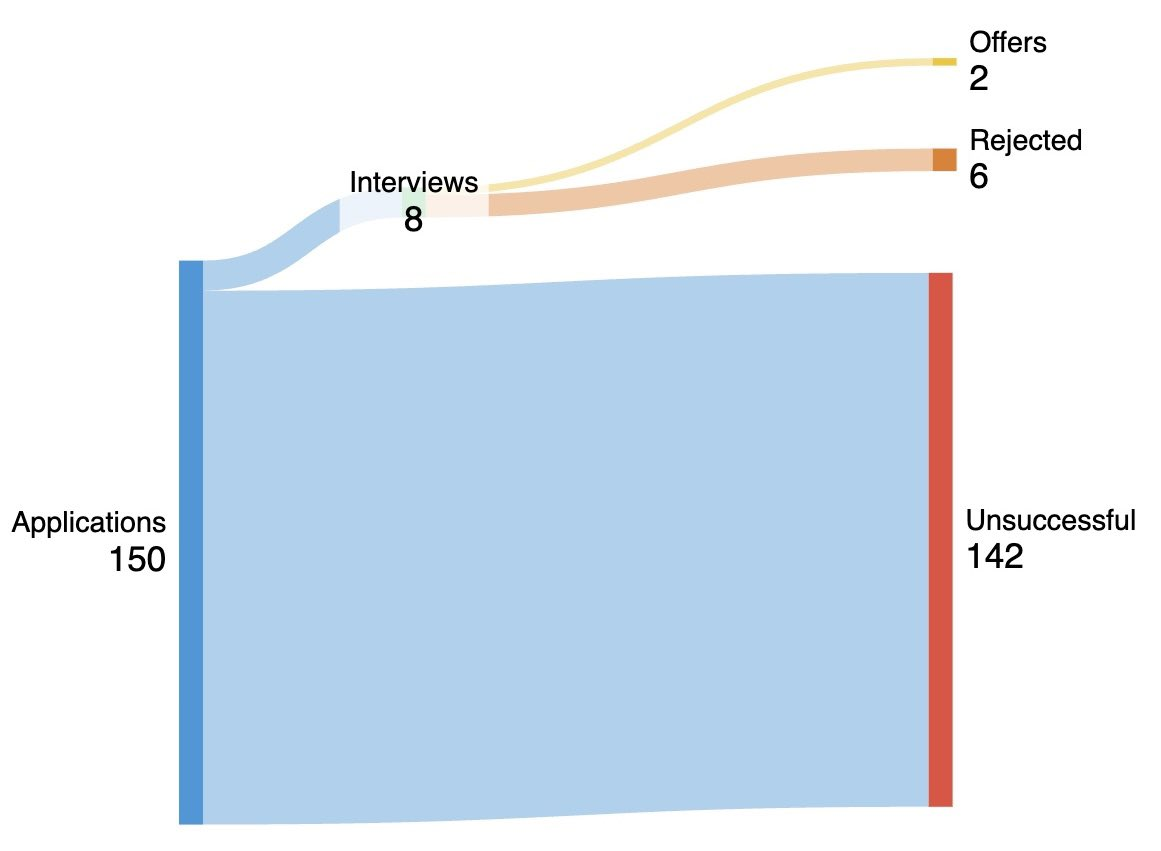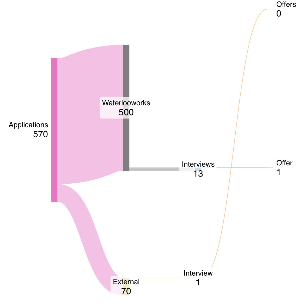 recruiting for my very first job back in the fall of 2024 was pretty stressful because although i was able to return back to an old company the feeling of me going back didn't feel good. i ended up applying to every job that i saw externally and through the school's portal. i sent cover letters for every single one and even tried to personalize my resume for each specific job posting. this became very tiring and i eventually stopped doing that. although i landed a few interviews, i wasn't so good at interviewing and my technical skills weren't too strong. i think i ended up with around 14 interviews total by the end of the term but i only had one offer of which i declined. i ended up joining a startup that was acquired by the company i had worked at the summer previously. i didn't get a job i truly wanted, but i learned a lot during the 4 months through job searching, interviewing and learning to stand out.
